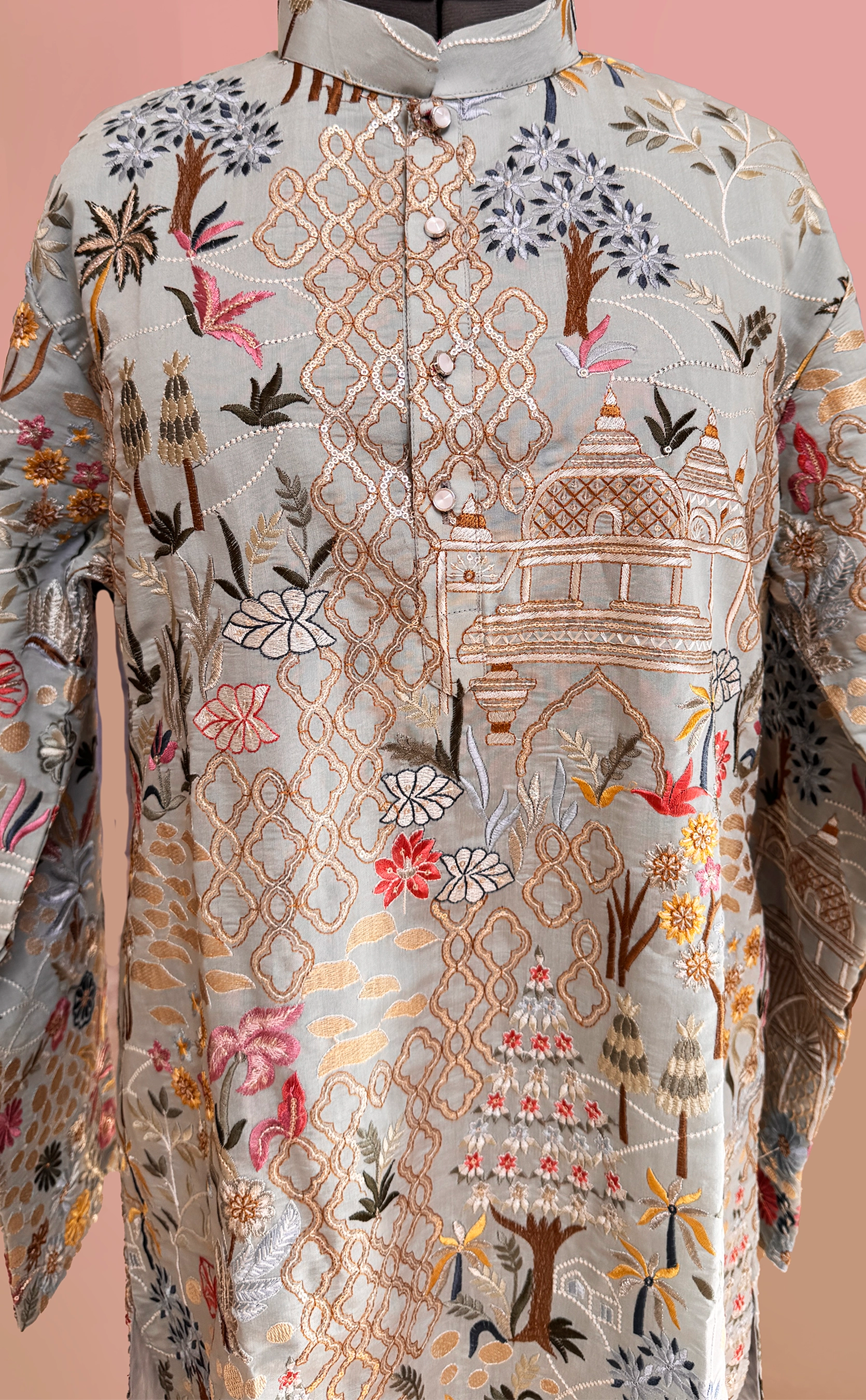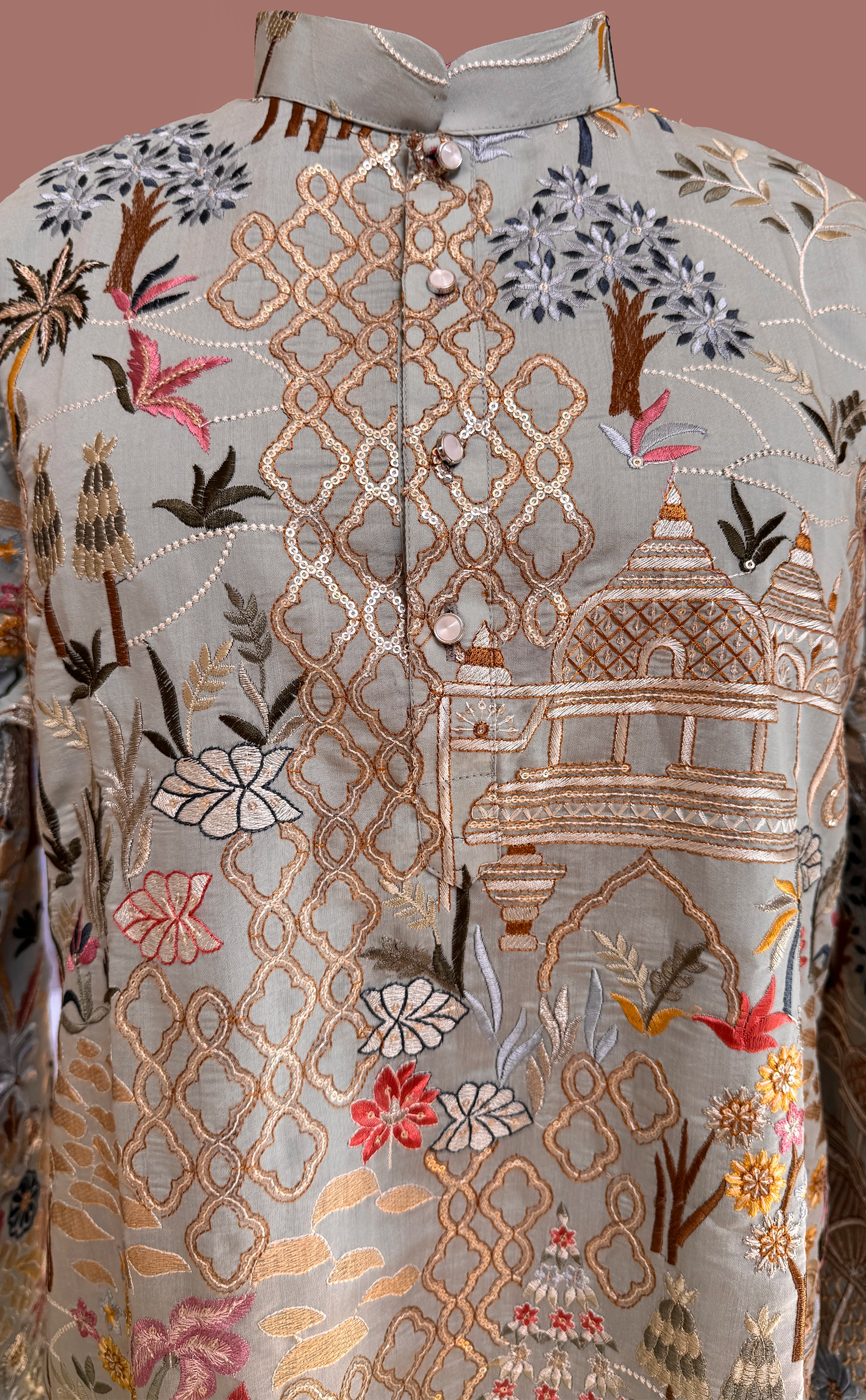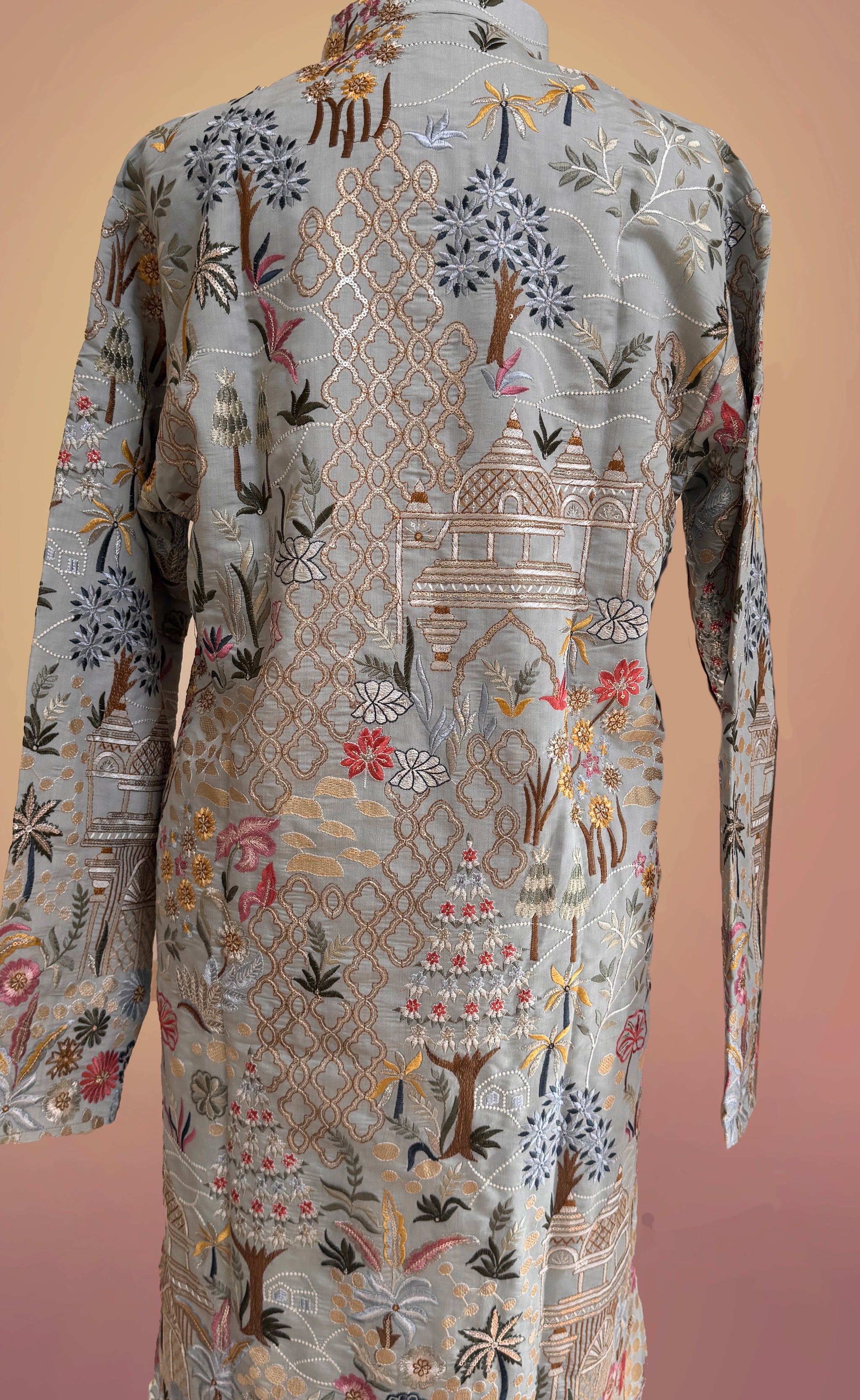 This blue printed kurta set is a beautiful blend of artistry and elegance, featuring an intricate all-over thread embroidery by nature and traditional motifs. Shades of coral, yellow, blue, and soft earthy tones come together to create a rich tapestry of florals, trees, and delicate patterns that give the outfit a unique and eye-catching character. Fine sequin embroidery is thoughtfully layered throughout the design, adding texture and subtle dimension that elevates the look while maintaining its refined charm.