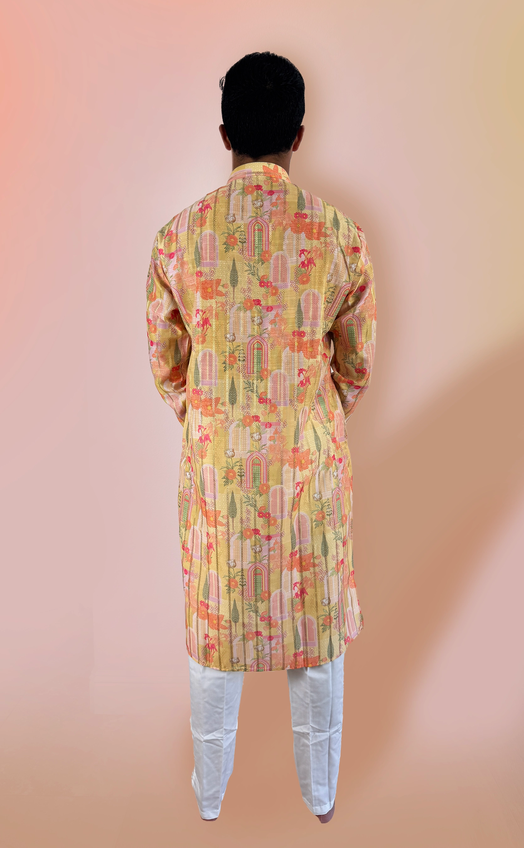 This sunshine yellow kurta bursts with color and character, featuring a lively floral and geometric print that feels both playful and refined. Perfect for festive occasions like Haldi, mehendi, or daytime celebrations, it brings easy charm to any look. Pair it with white pants (included) or linen trousers for a fresh, modern take on classic Indian menswear.